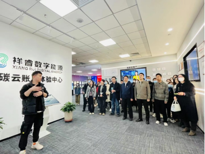 师生参观了流量生态园数字展厅,了解生态园区的基本概况,参观了入驻企业——祥睿数字能源低碳云账户体验中心。通过讲解,老师与同学们深入了解了流量生态园、祥睿数字能源在传统产业与数字能源融合发展取得的成绩,在面向高耗能行业、重点控排企业提供智慧能源管理、碳资产管理、碳中和服务、CCER开发交易、负荷聚合服务等高端能源服务中所做出的贡献,以及园区运行两年多以来取得的丰硕数字经济成果。